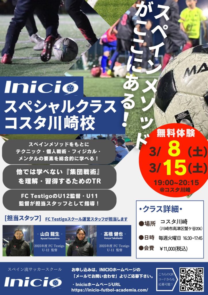 コスタ川崎校はInicio初のスペシャルクラス平日コース& FC TestigoのU12監替・ U11監替が担当スタッフとして指導します!